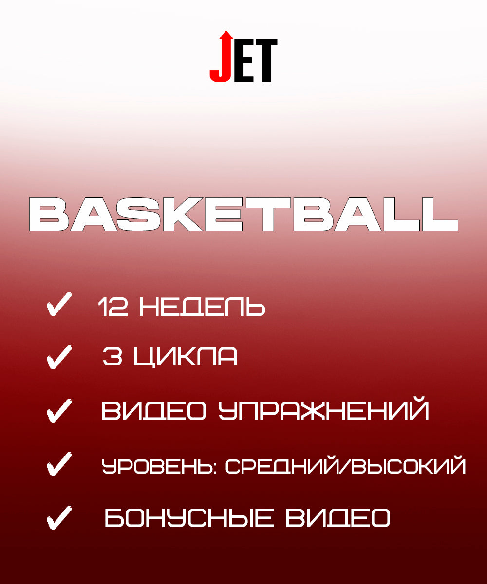 Программа тренировок «ДЖЕТ-БАСКЕТБОЛ» разработана специально для сезонных спортсменов, желающих усовершенствовать свой прыжок, не отклоняясь от основной баскетбольной подготовки.